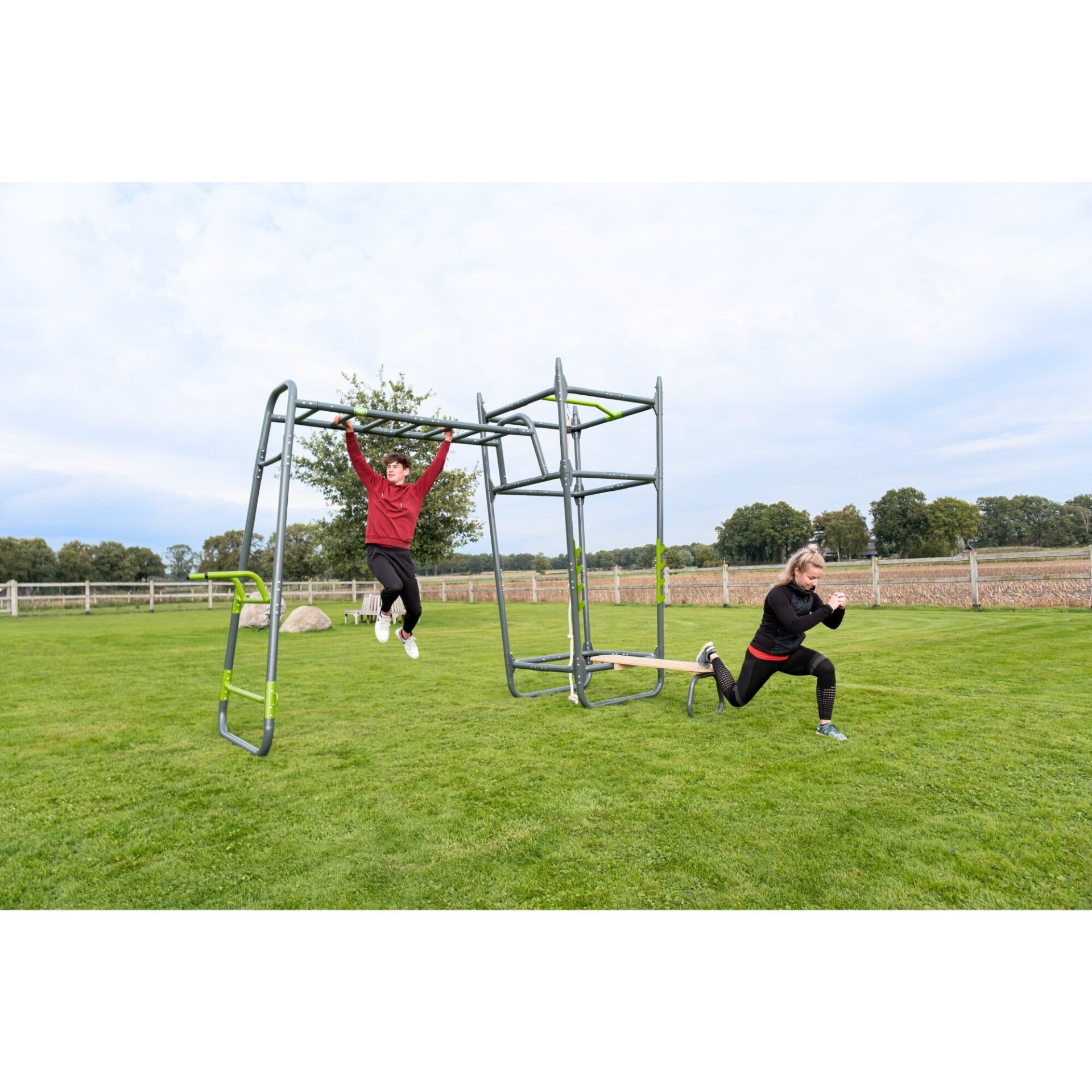 De EXIT GetSet PS510 is een fitnessrek van ruim vier meter voor buiten. De volgende accessoires zijn inbegrepen: push-up stang, dip station, battle rope ringen, bokszak, fitnessbank, haltersteunen, pull-up stang en klimtouw. Deze powerstation is multifunctioneel en biedt volop uitdaging voor sportieve 14-plussers en volwassenen. Haal de sportschool naar jouw huis met de GetSet PS510!