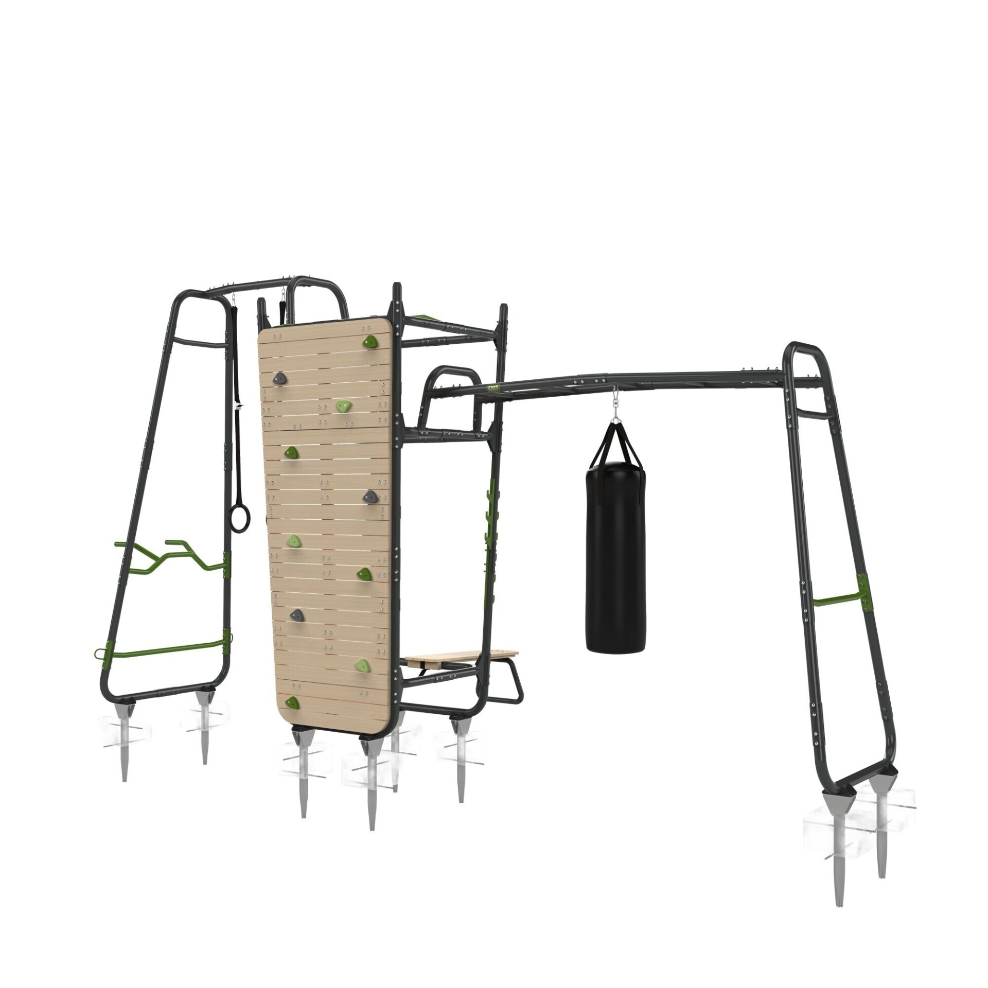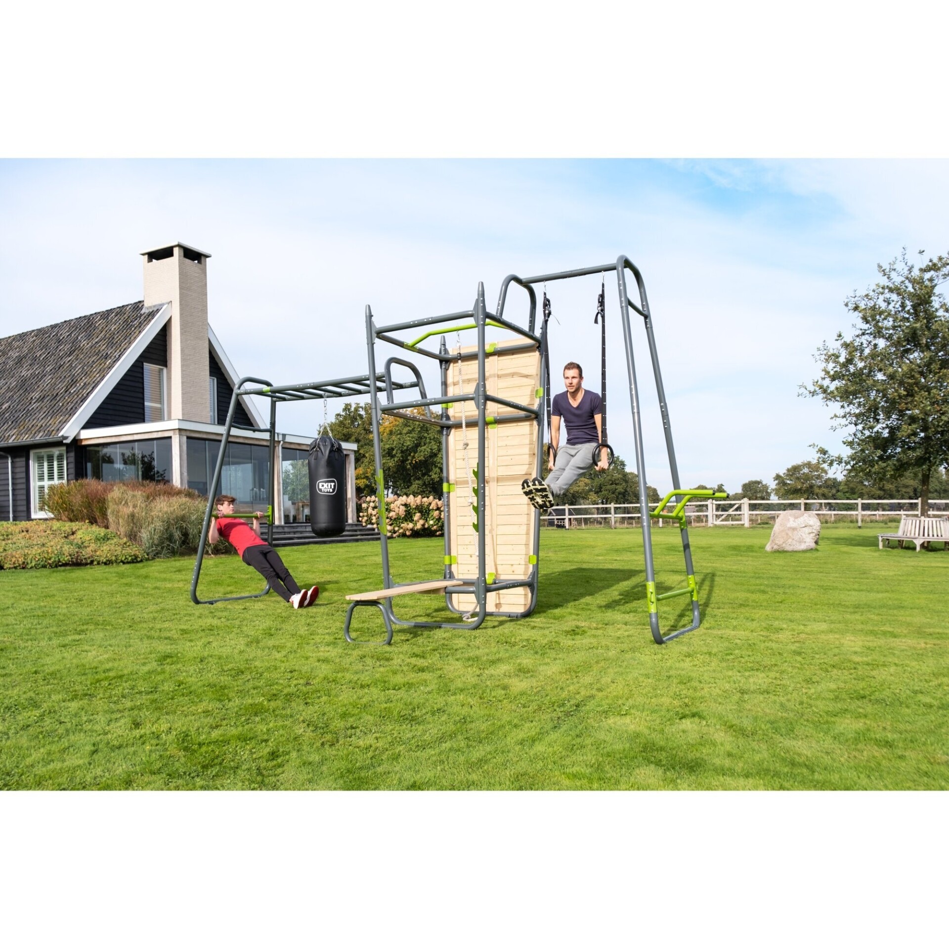 De EXIT GetSet PS620 is een fitnessrek van ruim zes meter voor buiten. De volgende accessoires zijn inbegrepen: oefenstang, bokszak, fitnessbank, haltersteunen, pull-up stang, klimtouw, kunststof turnringen, push-up stang, dip station, battle rope ringen, klimwand en handgrepen. Deze extra uitgebreide uitvoering is multifunctioneel en biedt volop uitdaging voor sportieve 14-plussers en volwassenen. Haal de sportschool naar jouw huis met de GetSet PS620!