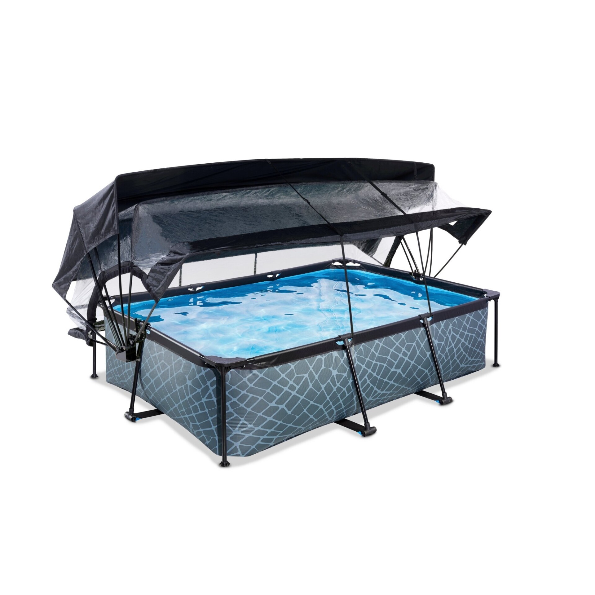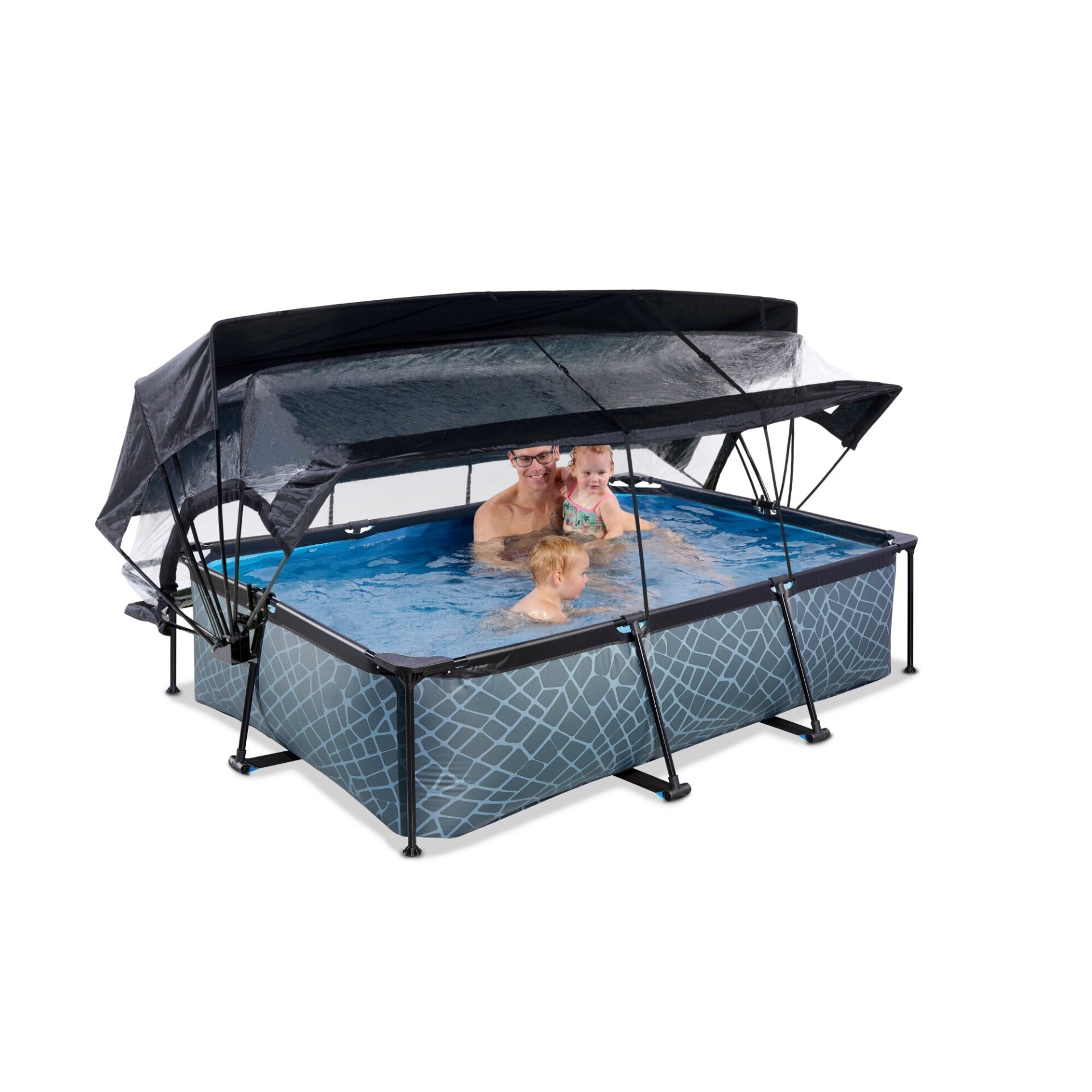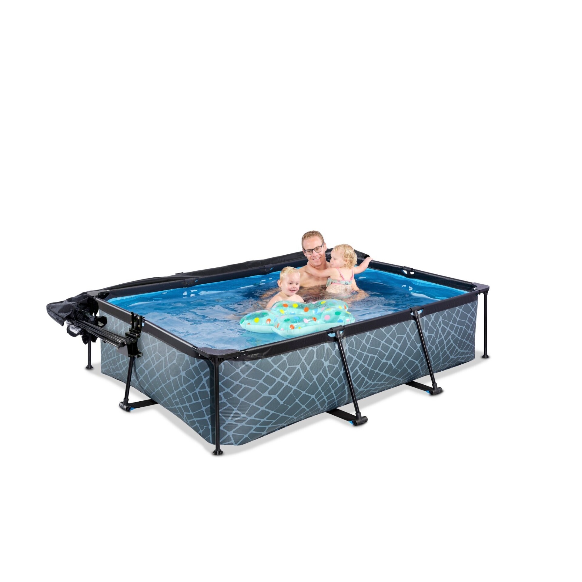 Het EXIT Stone zwembad 220 x 150 x 65 cm is een rechthoekig, grijskleurig frame zwembad met overkapping en schaduwdoek, die je op zomerdagen beschermt tegen de zon. Dit compacte zwembad is standaard voorzien van een filterpomp en valt op tussen andere baden door zijn stoere steenpatroon. Ben je op zoek naar een geschikt zwembad voor jonge kinderen die niet te veel ruimte in de tuin inneemt? Kies dan voor dit unieke en hoogwaardige frame zwembad met overkapping van EXIT Toys!