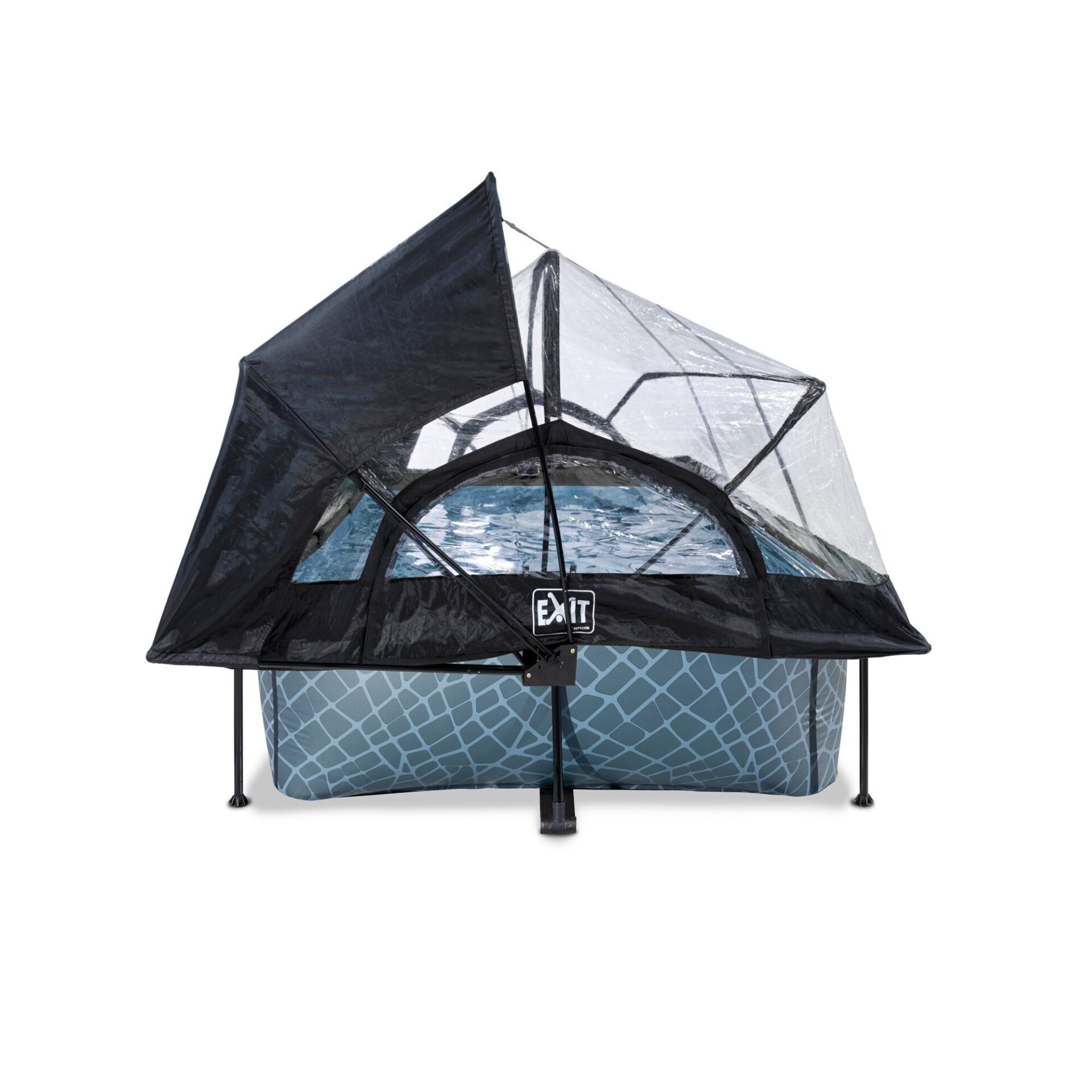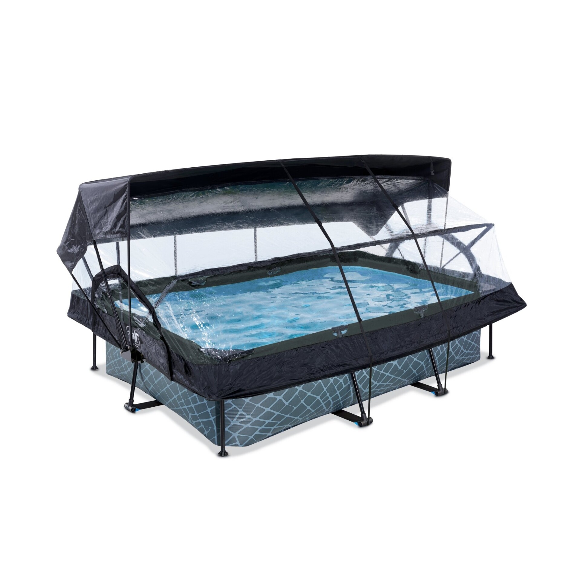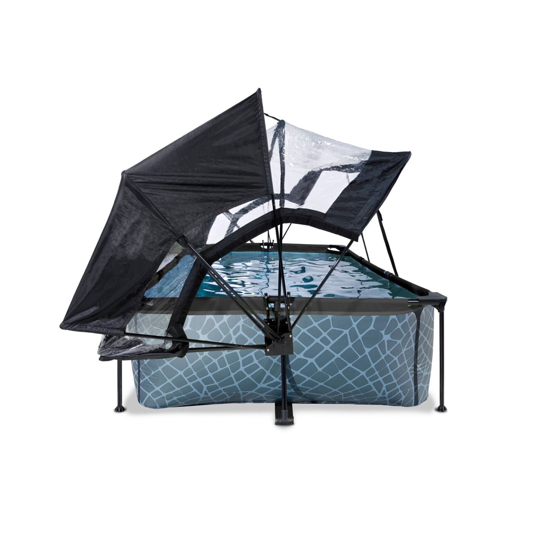 Het EXIT Stone zwembad 220 x 150 x 65 cm is een rechthoekig, grijskleurig frame zwembad met overkapping en schaduwdoek, die je op zomerdagen beschermt tegen de zon. Dit compacte zwembad is standaard voorzien van een filterpomp en valt op tussen andere baden door zijn stoere steenpatroon. Ben je op zoek naar een geschikt zwembad voor jonge kinderen die niet te veel ruimte in de tuin inneemt? Kies dan voor dit unieke en hoogwaardige frame zwembad met overkapping van EXIT Toys!