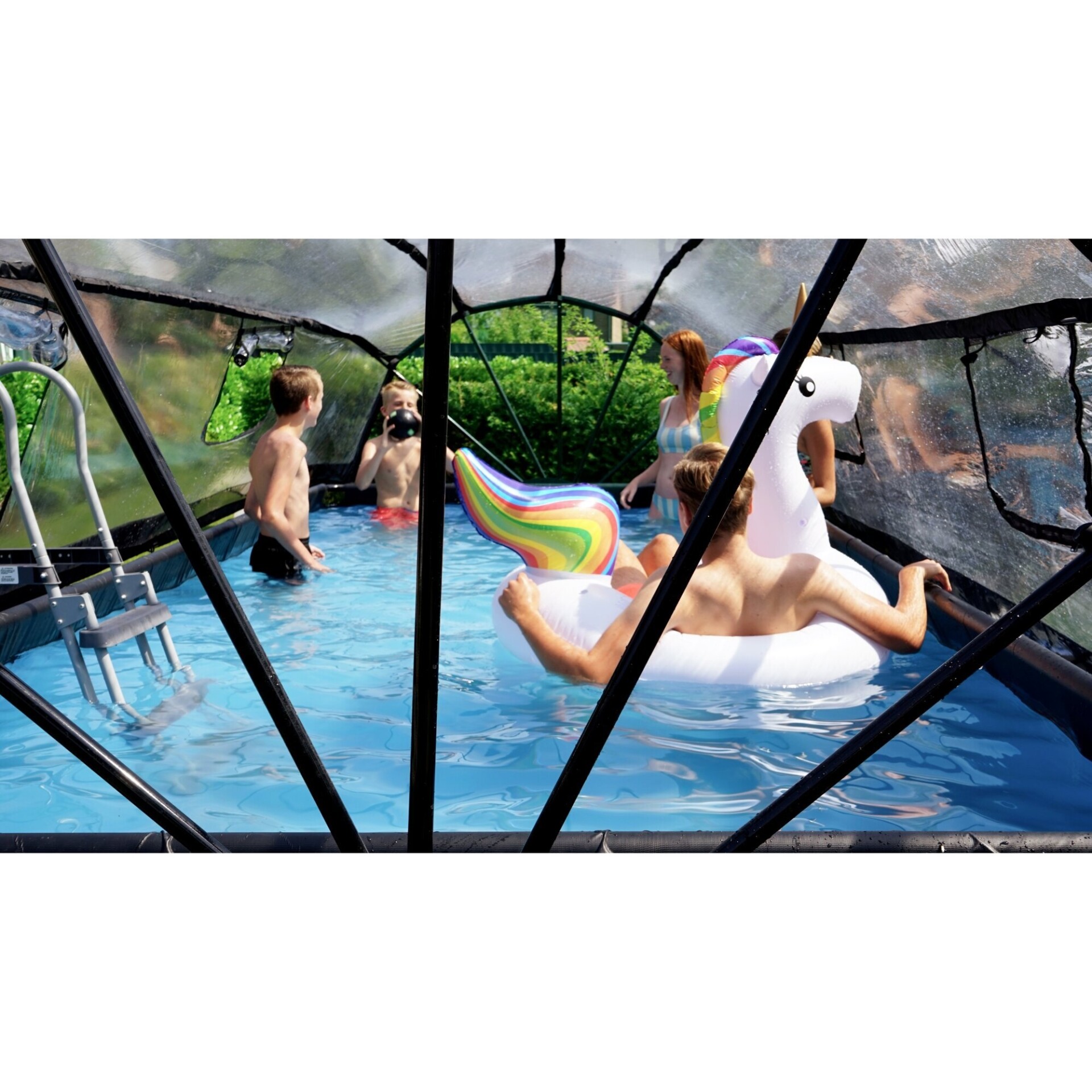 Met de EXIT overkapping voor zwembaden ben je niet langer afhankelijk van de weersvoorspellingen. De overkapping zorgt ervoor dat er geen vuil meer in het water kan komen en is tegelijkertijd een duurzame oplossing voor het verwarmen van je water, want de warmte van de zon wordt onder de kap vastgehouden. De overkapping is transparant en zeer eenvoudig te openen door geïntegreerde gasdrukveren. Ook heeft de overkapping drie opvouwbare ramen en een deur. Kortom: in weer en wind genieten van je zwembad.