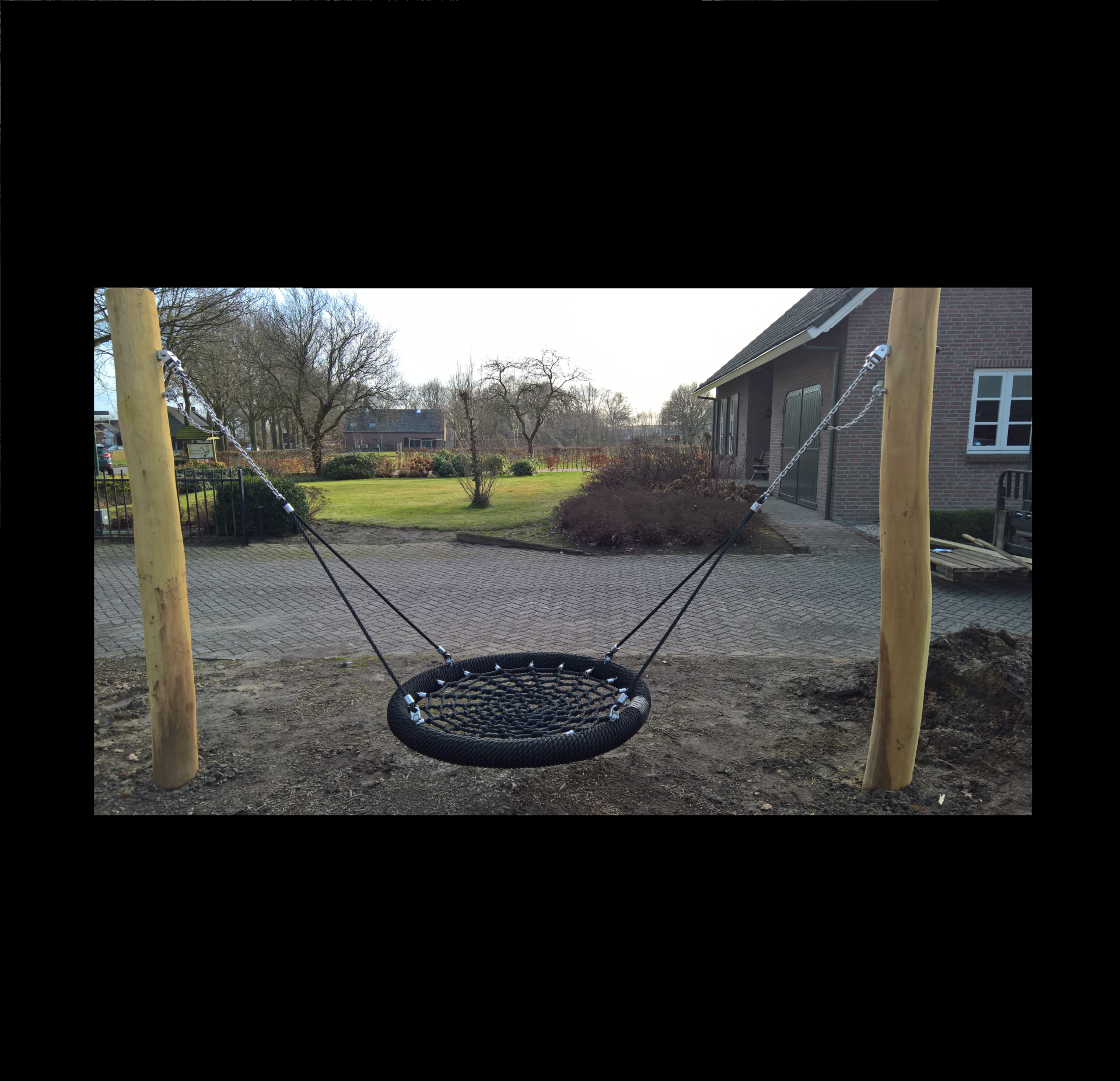 • Staanders robinia spintvrij en geschuurd rond 18-20, r.v.s. schommelhaken en vogelnestschommel doorsnede 120cm.