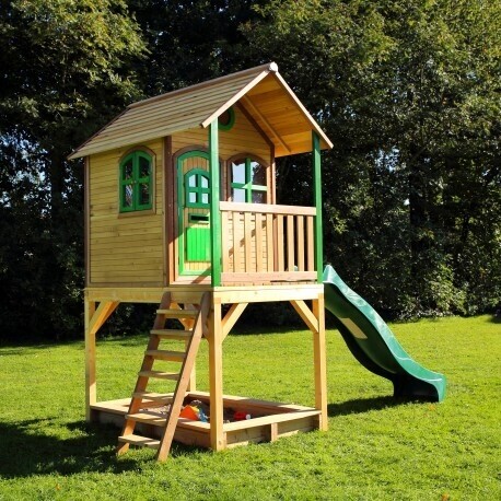 Sarah is een middelgroot houten (Julia) speelhuis op een hoge opbouw en heeft echt alles wat je je maar wensen kunt! Een trap om in het huisje te klimmen en vervolgens van de lange glijbaan naar beneden te roetsjen. En dan ben je nog niet uitgespeeld, want onder het speelhuis is ook nog een zandbak waar je met z'n allen zandtaartjes kunt bakken.