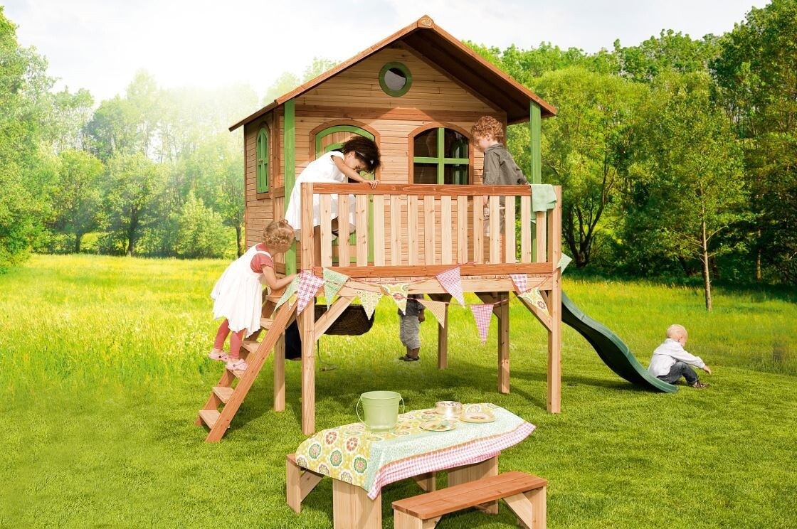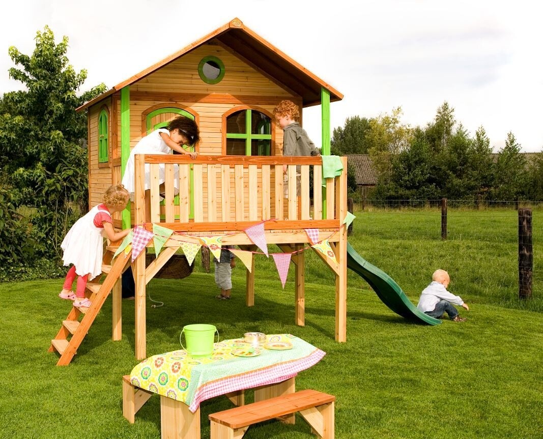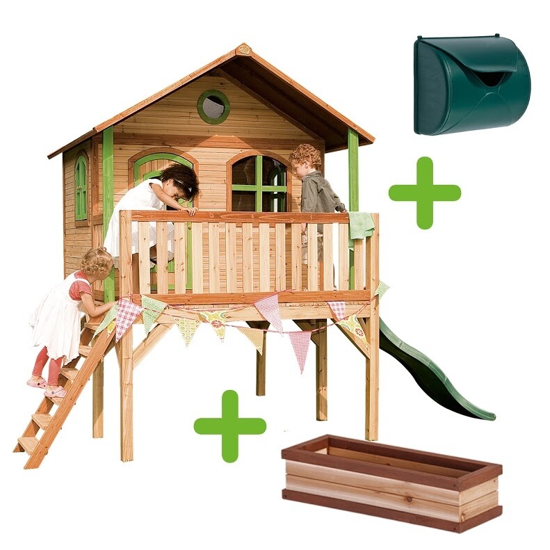 Speelhuis Sophie is een groot speelhuis op hoge poten met aan de ene zijde een trappetje en aan de andere zijde een lange glijbaan. Hierin kun je iedereen wel in uitnodigen, ruimte genoeg! Voordeur en ramen halfrond en kunnen beiden open en dicht. Cederhouten planken: 15 mm. Framewerk: 38 mm. 100 % FSC hout.