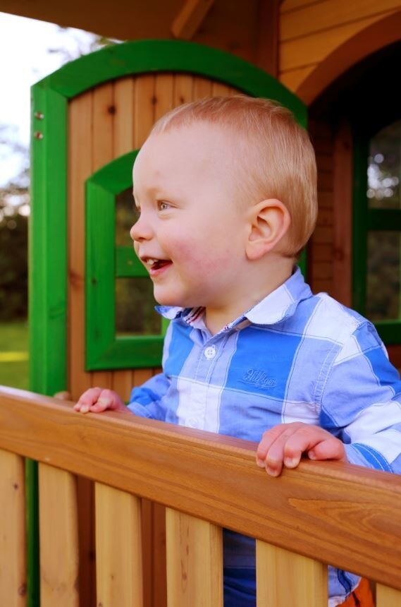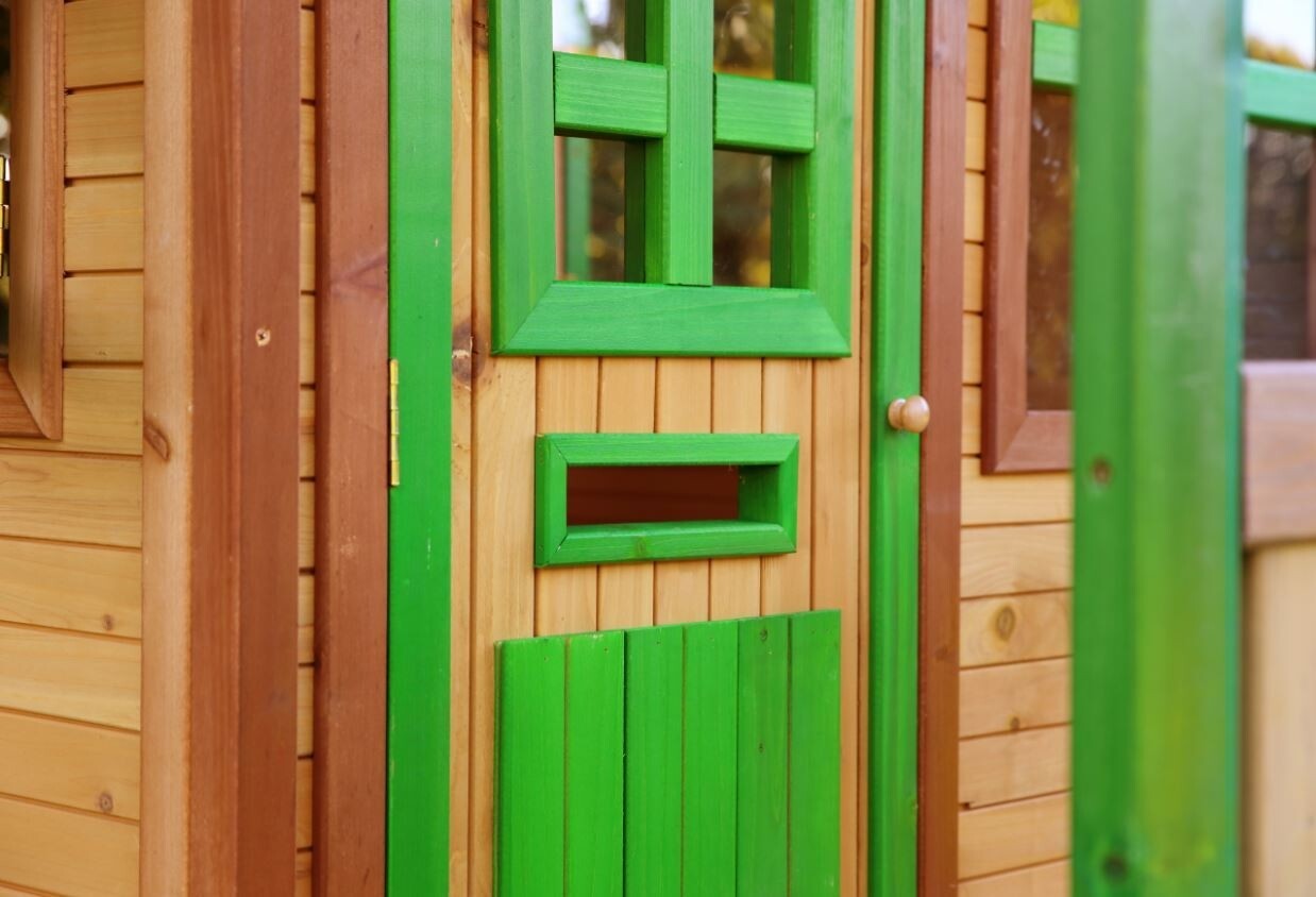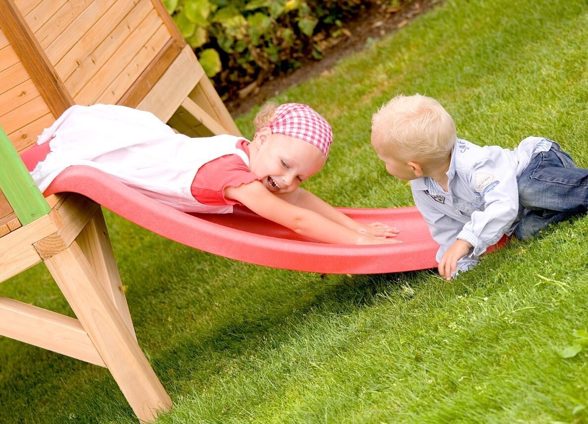 Het houten speelhuis Tom heeft een halfronde deur en ramen. Het huisje is voorzien van een veranda met aan de ene zijde een trapje en aan de andere zijde zoef je naar beneden op de glijbaan. Ramen kun je bij mooi weer open doen, bij minder mooi weer doe je ze gewoon weer dicht. Cederhouten planken: 15 mm. Framewerk: 38 mm. 100 % FSC hout.