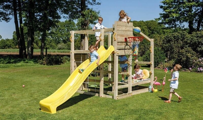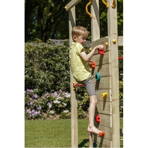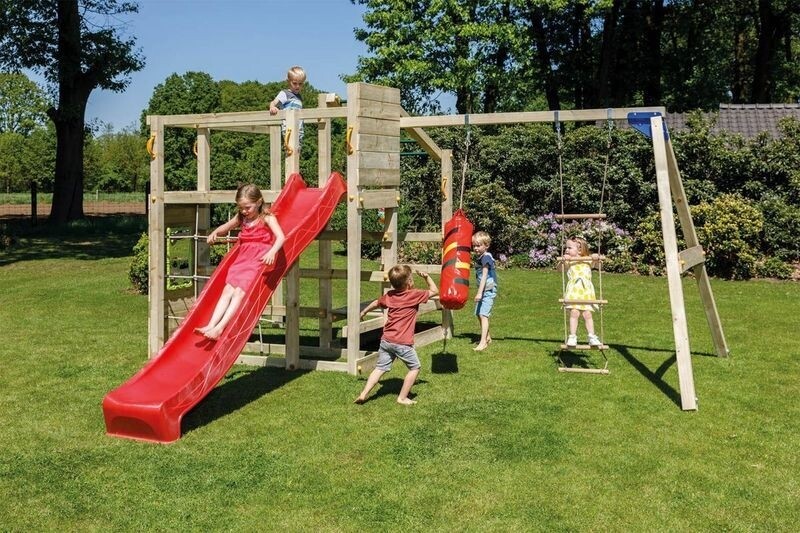 Het speeltoestel is uit te breiden met allerlei leuke aanbouwelementen zoals een aanbouwschommel. Aan het zijpaneel kan een basketbalring worden bevestigd.
