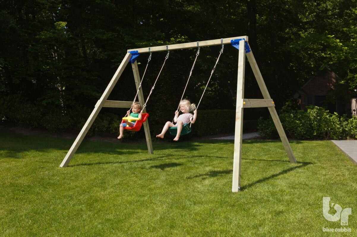 Met deze schommelconstructie kun je echt alle kanten op. Kies uit de vele beschikbare schommelzitjes, trapezes, ringen om aan deze schommelconstructie te bevestigen. Of begin met een babyzitje en groei met je kind mee door er later een ander zitje aan te bevestigen. De constructie wordt standaard zonder zitje geleverd.