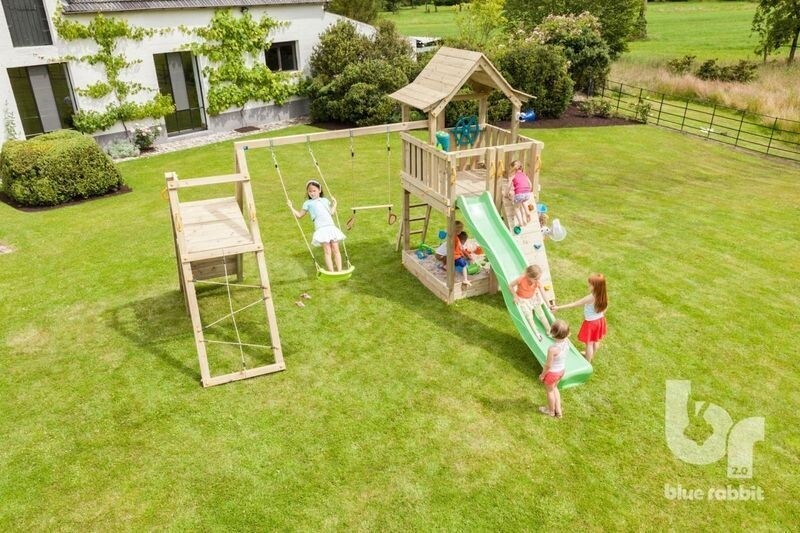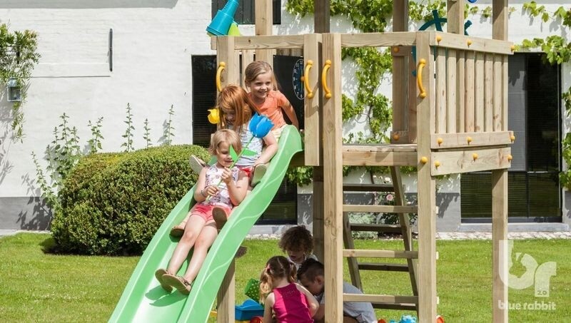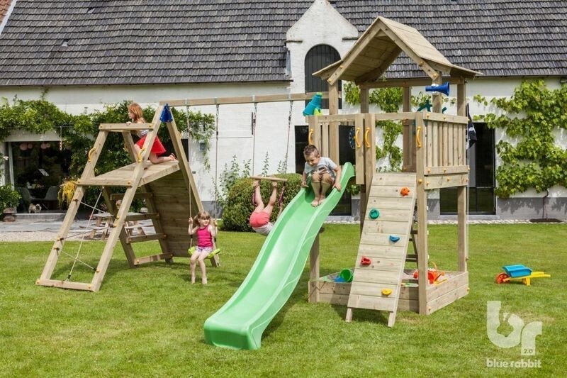 Speelruimte in overvloed in deze mooie Pagoda speeltoren. Onder de toren bevindt zich een zandbak waarin kinderen zich uren kunnen vermaken. De speeltoren is voorzien van twee ladders, een schuine en een verticale. De Blue Rabbit Pagoda speeltoren wordt geleverd inclusief @challenger, een dubbele schommel met 2 klimwanden.