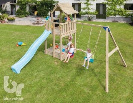 Speelruimte in overvloed in deze mooie Pagoda speeltoren. Onder de toren bevindt zich een zandbak waarin kinderen zich uren kunnen vermaken. De speeltoren is voorzien van twee ladders, een schuine en een verticale. De Blue Rabbit Pagoda wordt geleverd inclusief @swing, een dubbele schommel. Houtsoort: vuren hout