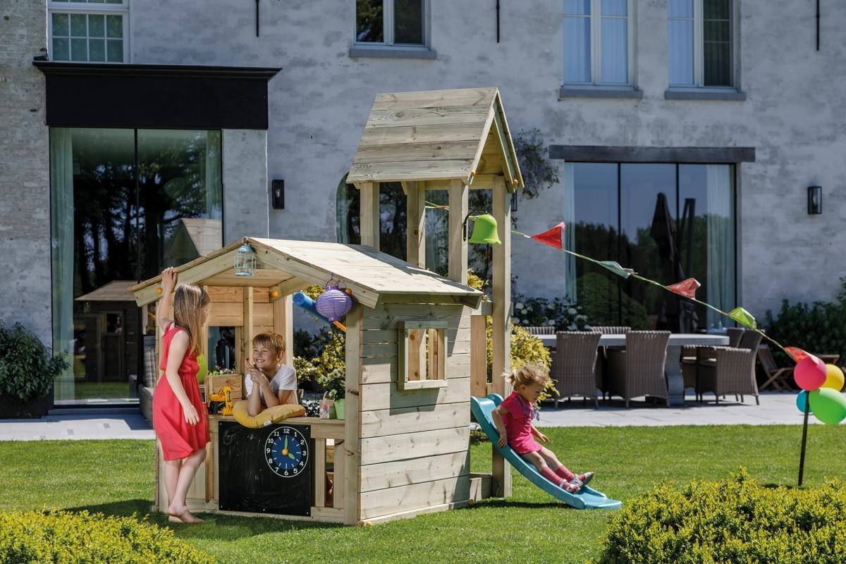 Dubbel veel plezier met deze 2 elementen aan elkaar. De Lookout is een speeltoren met speelhuisje eraan vast. Het platform van de speeltoren is te monteren op 60 of 90 cm waar een glijbaan aan te plaatsen is. Het speelhuisje heeft een deur met een magnetisch slot. Aan de zijkant bevind zich een toonbank om winkeltje of een ander rollenspel te spelen. Als de speeltoren gemonteerd is op 90 cm platformhoogte kan de Lookout uitgebreid worden met bijvoorbeeld een schommel.