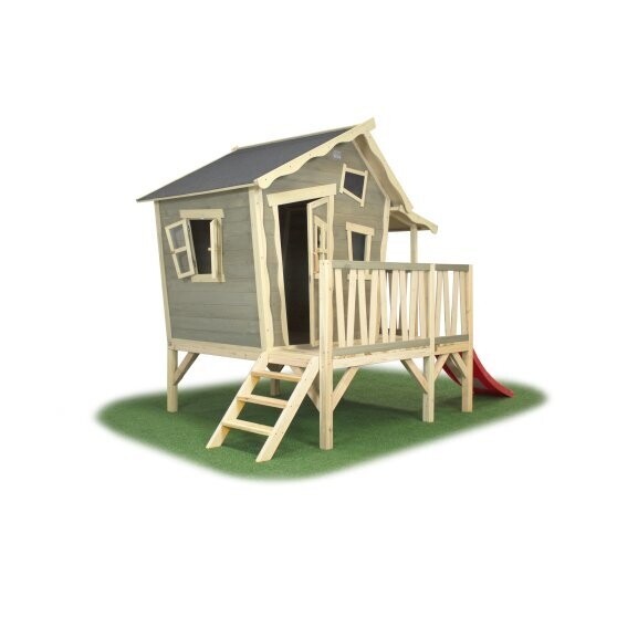 Het EXIT Crooky 350 houten speelhuis in de kleur grijsbeige is een stoere ‘blokhut’ met glijbaan waarin kinderen urenlang speelplezier kunnen beleven. Dit houten speelhuis staat op poten, heeft een veranda en dankzij de vooraf gemonteerde panelen kun je het speelhuis binnen no-time in elkaar zetten. Het EXIT Crooky 350 houten speelhuis met glijbaan heeft een natuurlijke uitstraling en een speels design met onder andere schuine raampjes, een schuin dak en een schuine deur.
