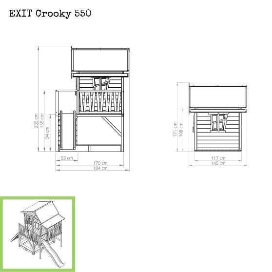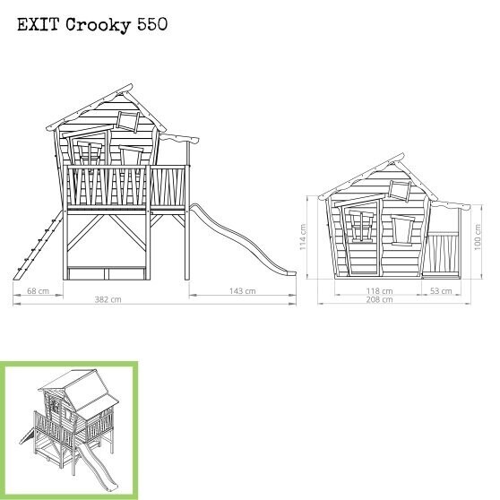 Het EXIT Crooky 550 houten speelhuis in de kleur grijsbeige is een stoere ‘blokhut’ met glijbaan en zandbak waarin kinderen urenlang speelplezier kunnen beleven. Dit houten speelhuis staat op poten, heeft een veranda en dankzij de vooraf gemonteerde panelen kun je het speelhuis binnen no-time in elkaar zetten. Het EXIT Crooky 550 houten speelhuis met veranda, glijbaan en zandbak heeft een natuurlijke uitstraling en een speels design met onder andere schuine raampjes, een schuin dak en een schuine deur.