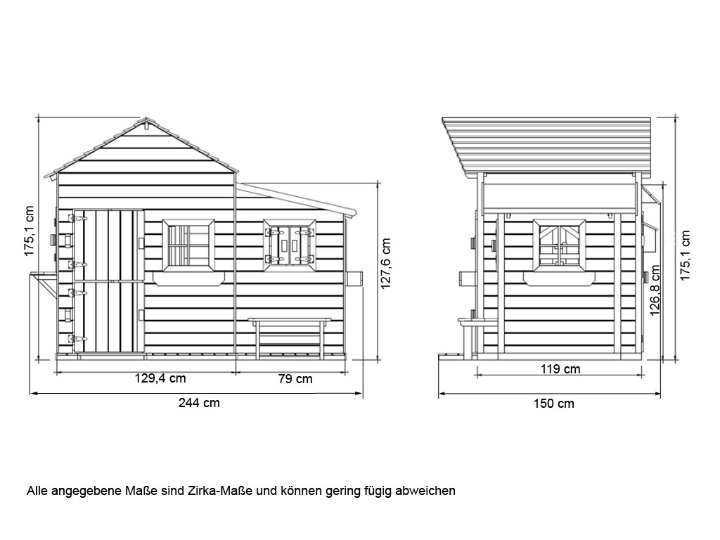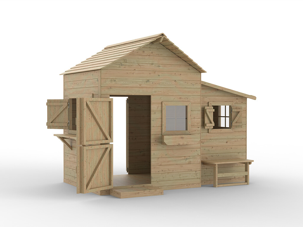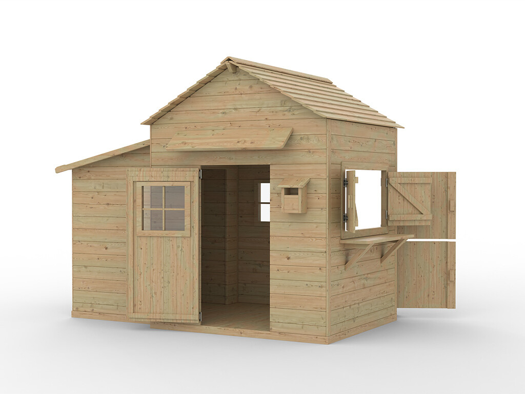 Op zoek naar een houten speelhuisje met sfeer? Dan is houten speelhuisje Butterfly het perfecte huisje. Het houten speelhuisje bestaat uit een basishuisje met daaraan een aanbouw. De karakteristieke details geven het huisje een lieflijke uitstraling. Rondom is het speelhuisje voorzien van veel raampjes en zelfs 2 deuren. Het houten speelhuisje is geïmpregneerd en vrij eenvoudig in elkaar te zetten. De dikte van het hout is 12 mm. Het basishuisje heeft een gepotdekseld dak, de aanbouw heeft dakleer.