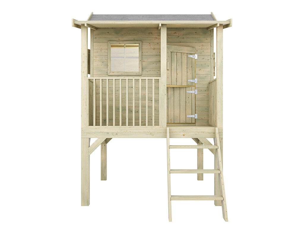 Dit speelhuis met zijn tweedelige deur biedt uw kinderen unieke ervaringen binnen hun eigen vier muren. Het huiselijke karakter wordt gecompleteerd door de veranda, de luiken en de bloembakken.