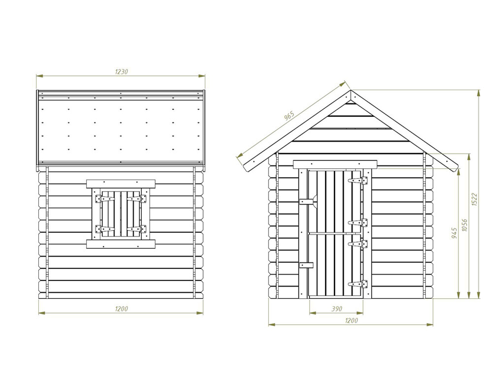 Afmetingen van het speelhuisje zijn 120cm lengte x 120cm breedte x 158cm hoogte.
