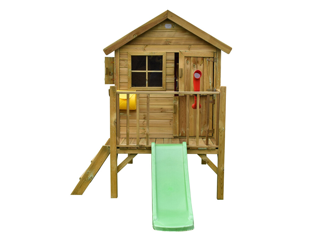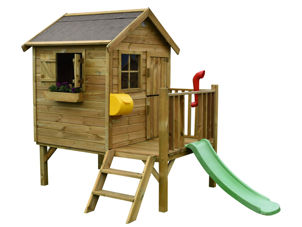 Houten speelhuis Funny L is een zeer stevig en stabiel speelhuis met diverse leuke items er op en er aan. Ook leuk uit te breiden met de accessoires.