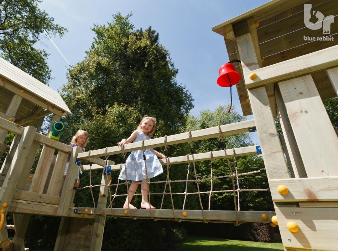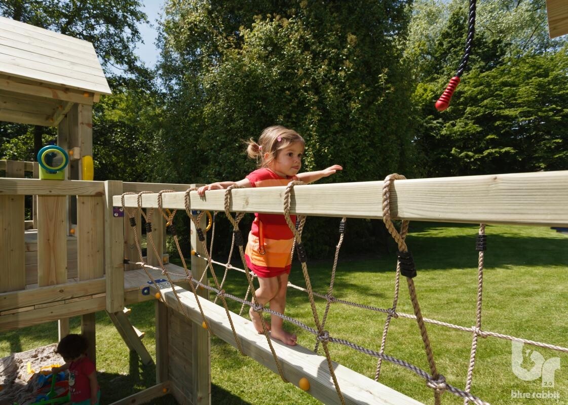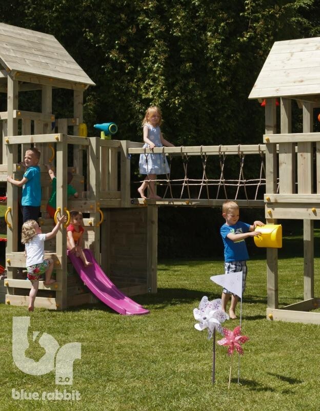 Verbind twee speeltorens met elkaar voor nog meer speelplezier. Over de balk loop je zo van de ene speeltoren naar de andere. De brug wordt tussen twee speeltorens bevestigd met behulp van stevige metalen connectoren. Deze zijn afgewerkt in helder blauwe poedercoating. De brug module is geschikt voor de meeste Blue Rabbit speeltorens, indien ze eenzelfde platformhoogte hebben.