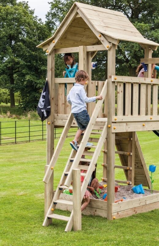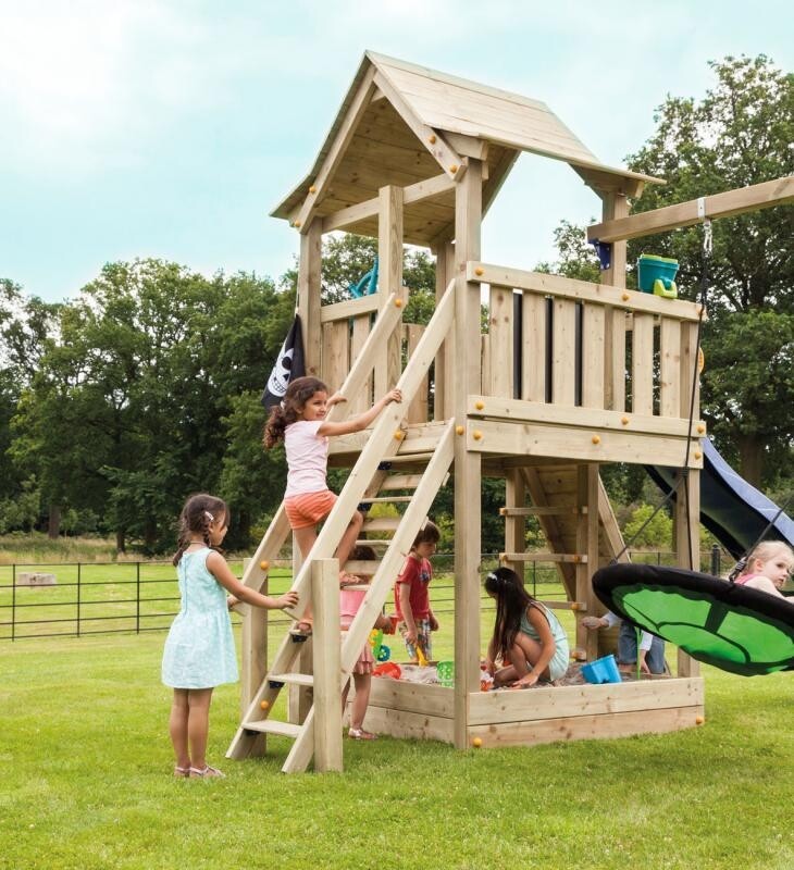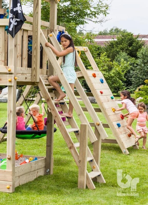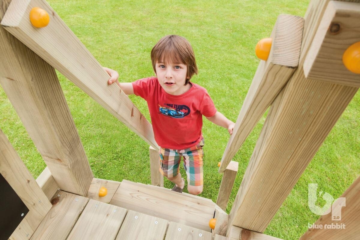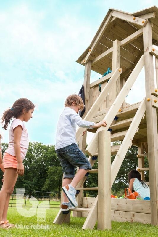Trap met aan beide zijdes een leuning; zo wordt naar boven klimmen extra veilig. Deze @Steps is geschikt voor Blue Rabbit speelhuizen met een platformhoogte van 150 cm. Is je platform lager kun je de ladder iets schuiner zetten of een stukje inkorten.