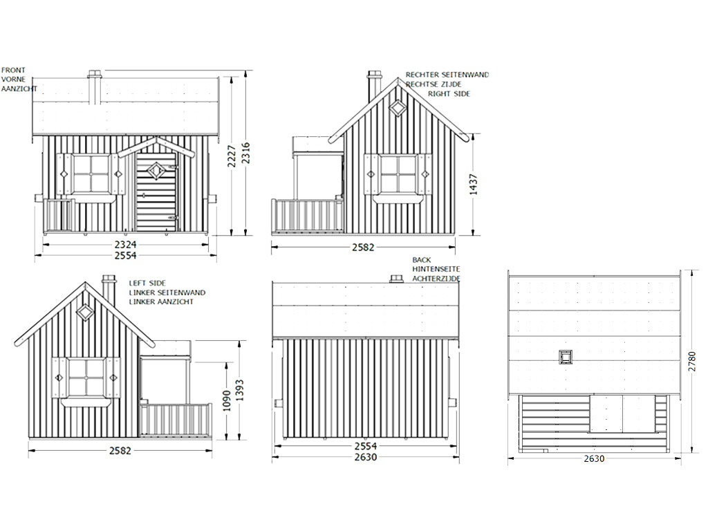 - Het speelhuis is 255cm breed, 259cm diep en 278cm hoog.
