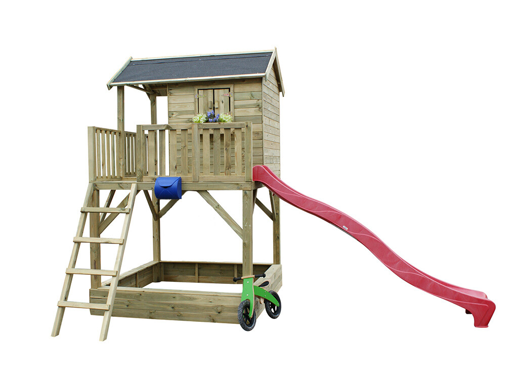 De 14 mm dikke paalwoning met veranda en balkon wordt een blikvanger in je tuin en zorgt voor veel speelplezier voor de kinderen.