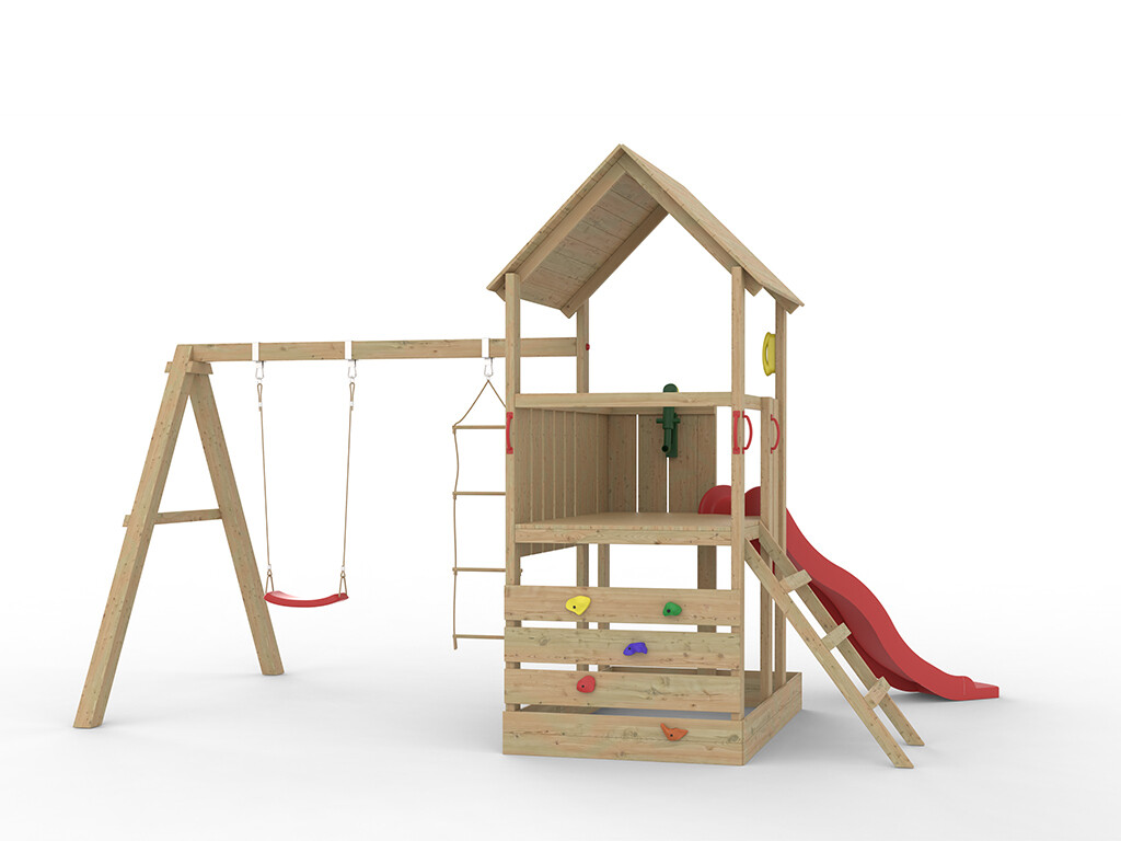 De speeltoren wordt geleverd met een enkele schommelbevestiging, touwladder, klimwand, ladder, handvat en andere accessoires en zorgt voor veel speelplezier voor de kinderen.