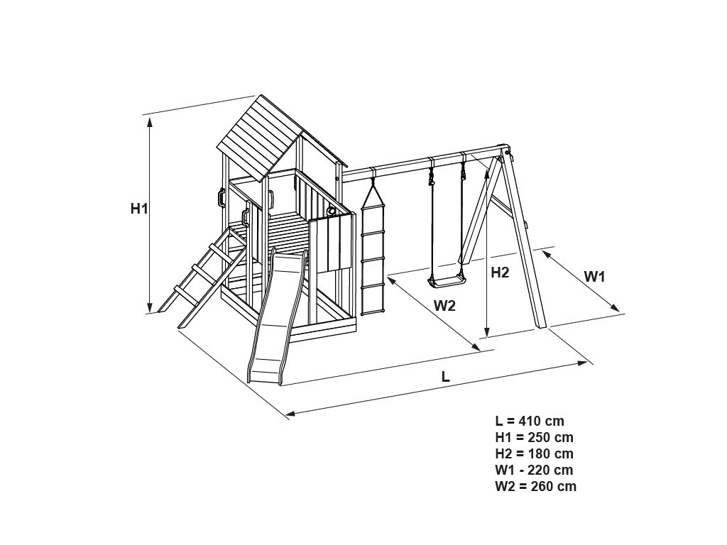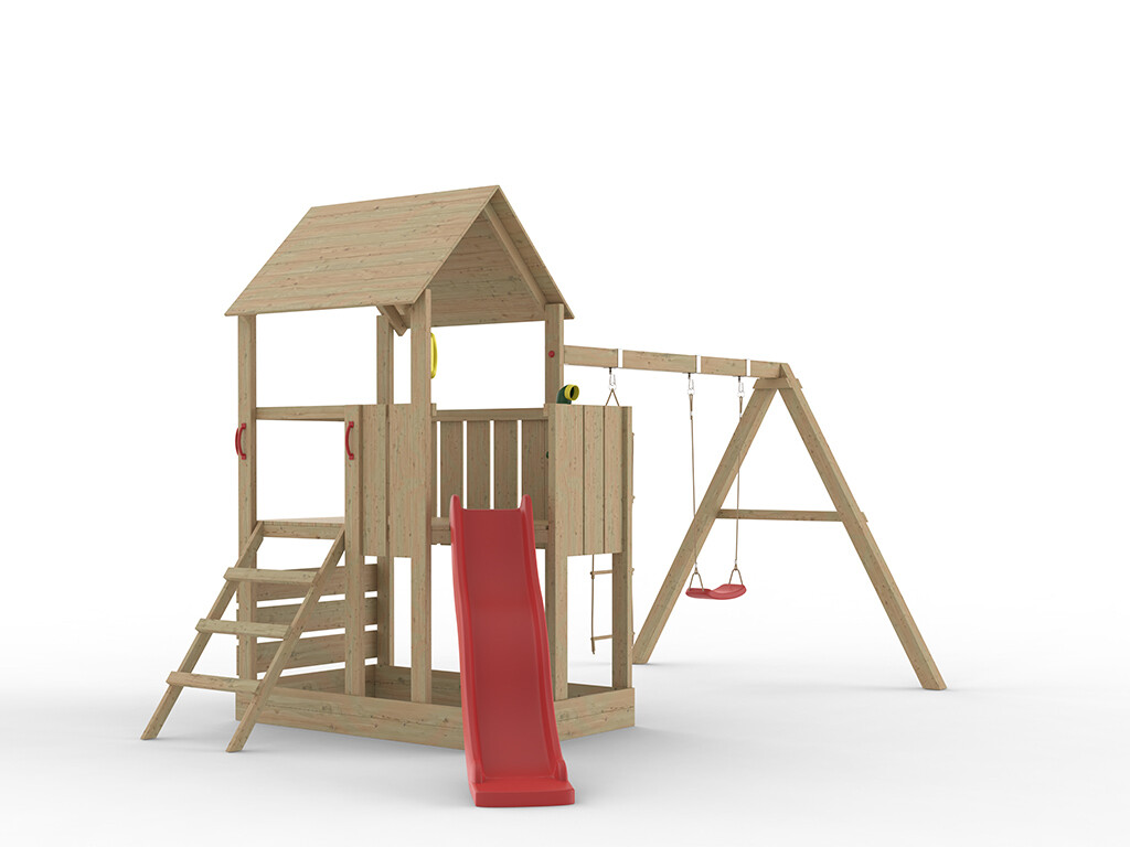 De speeltoren met schommelbevestiging en het extra grote, 16 mm dikke houten dak, dat bescherming biedt tegen zon en regen, biedt zelfs de allerkleinsten veel mogelijkheden om veilig te spelen. De klimwand met klimstenen of de ladder met bevestigde houten sporten zijn geschikt om het 90 cm hoge platform te bereiken. Onder de speeltoren bevindt zich een grote zandbak.