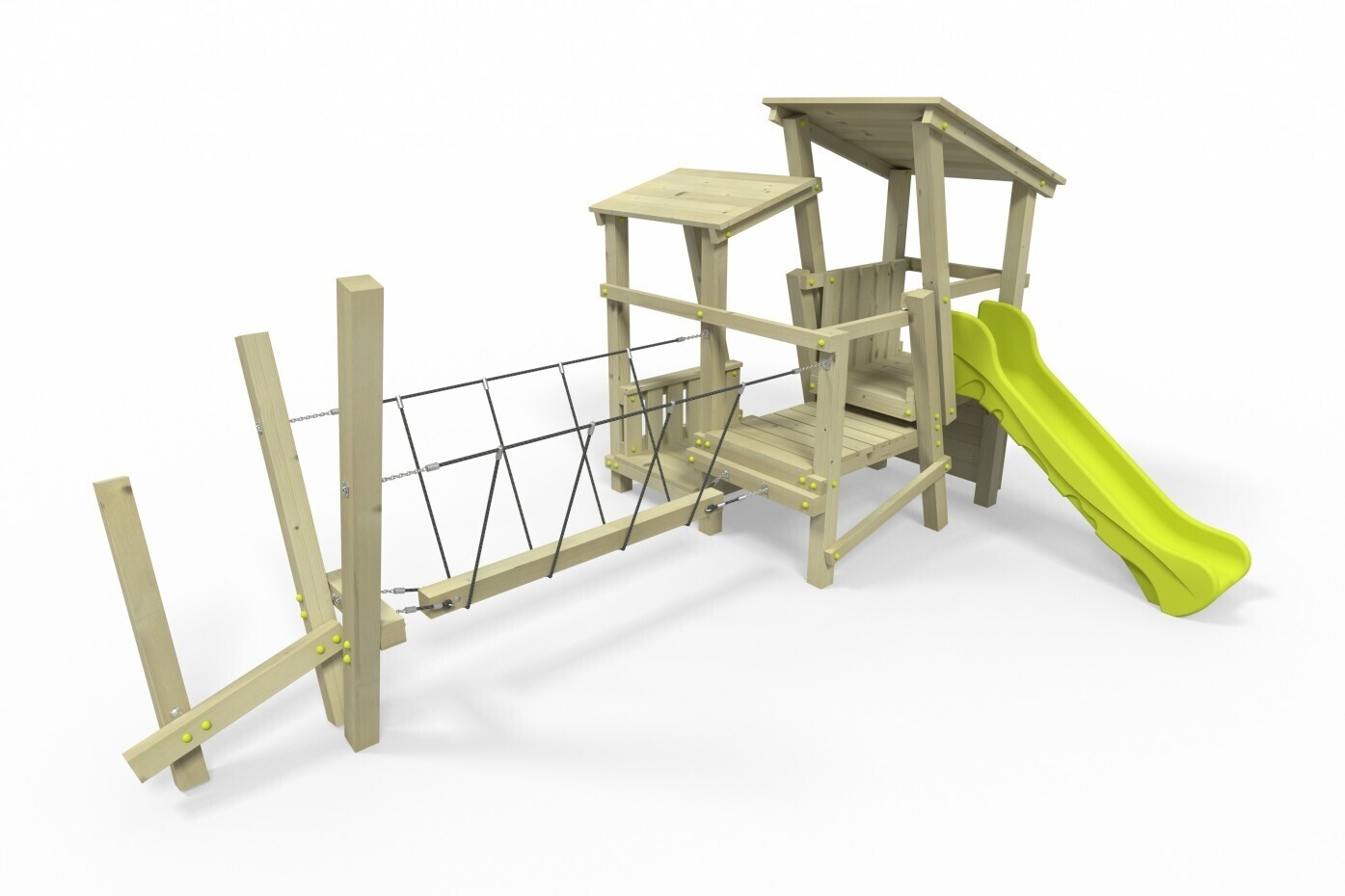 Het S-Line houtpakket bestaat uit palen (120x120mm), balken (70x45mm), planken (27x145mm).De touwen zijn van gewapend touw. Dit betekent een stalen kern, omwikkeld met pp-touw.